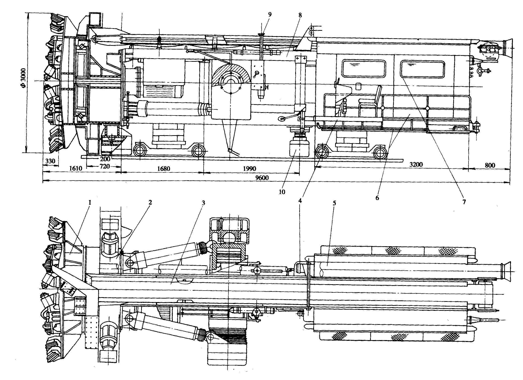 1-切削頭工作機(jī)構(gòu);2-前支承靴;3-排渣皮帶機(jī);4-液壓泵;5-吸塵風(fēng)管;6-機(jī)架及駕駛室;7-配電室;8-機(jī)架大梁;9-電鉆;10-后支撐座