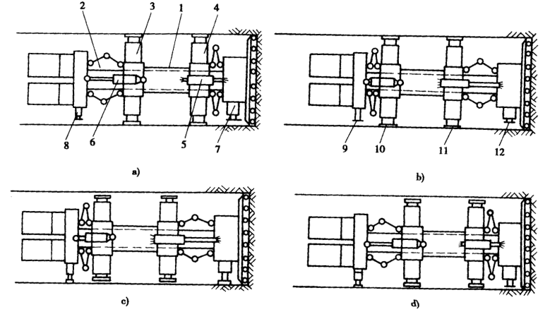 將水平支撐靴10、11頂緊洞壁,前后支撐靴9、12縮回,開動切削頭旋轉(zhuǎn),后推進(jìn)油缸6收縮,前推進(jìn)油缸5伸出,開動排渣用的輸送機(jī),如圖11-5 a)所示;當(dāng)切削頭掘進(jìn)一定深度時(一般為推進(jìn)油缸的一個行程)(如圖11-5 b所示),將前后支撐靴9、12頂緊洞壁,水平支撐靴縮回,后推進(jìn)油缸伸出、前推進(jìn)油缸縮回,如圖11-5 c)所示,這樣掘進(jìn)機(jī)外機(jī)架前移一段距離,如圖11-5 d)所示。按上述程序機(jī)器不斷旋轉(zhuǎn)掘進(jìn),不斷換位前移,直至完成隧道開挖工作。