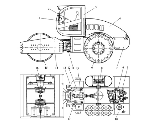 1-電氣系統(tǒng);2-操作系統(tǒng);3-駕駛室;4-覆蓋件;5-液壓系統(tǒng);6-發(fā)動(dòng)機(jī)總成;7-后車架;8-后橋;9-后輪;10-變速器;11-中心鉸接架;12-轉(zhuǎn)向油缸;13-行走馬達(dá);14-前車架;15-振動(dòng)輪總成;16-行走馬達(dá);17-液壓油箱;18-柴油箱