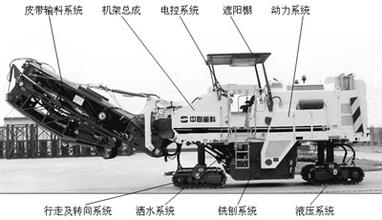 一般銑刨機由發(fā)動機、車架、銑削轉(zhuǎn)子、銑削深度調(diào)節(jié)裝置、液壓元件、集料輸送裝置、轉(zhuǎn)向系及制動系等組成。