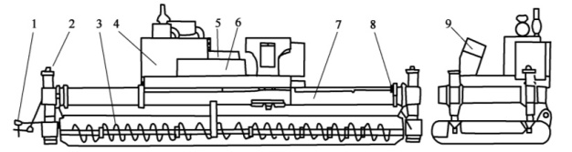1-找平和轉(zhuǎn)向自動(dòng)控制系統(tǒng);2-主柱浮動(dòng)支撐系統(tǒng);3-工作裝置;4-動(dòng)力裝置;5-傳動(dòng)裝置;6-輔助裝置;7-機(jī)架;8-行走及轉(zhuǎn)向裝置;9-電液控制和操縱裝置