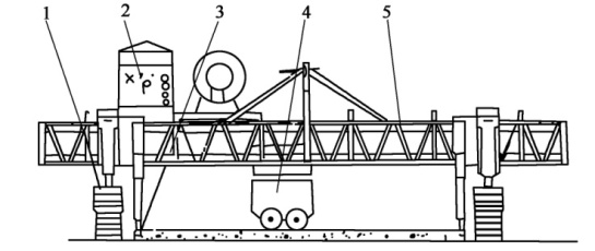 1-螺旋分料裝置;2-計(jì)量裝置;3-側(cè)模裝置;4-修邊器;5-內(nèi)部振搗裝置;6-定型抹光裝置;7-拱度調(diào)節(jié)設(shè)置;8-中間支梁; 9-外部振搗裝置;10-成型裝置;11-兩端支梁