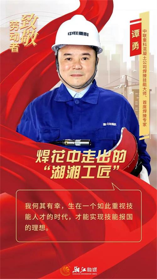 譚勇,湖湘工匠,從事焊接工作26年,是中聯重科唯一取得11項全國通用焊接資格證書并拿到美國ABS(壓力容器)焊接證書的首席焊接專家,也是中聯重科“譚勇省技能大師工作室”創始人,先后培養出2300余名優秀焊工學徒,為湖南省打造國家重要先進制造業高地輸送了一批批優秀技能人才。